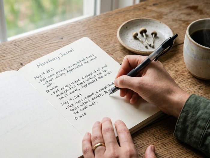 Journaling is the most reliable integration tool available. It doesn’t need to be elaborate. Even three sentences at the end of each dose day – what you noticed, what challenged you, what you’d do differently – creates a record that reveals patterns over weeks and months. You might notice that certain people consistently drain you, that mornings are your most protected time, or that your boundary skills improve dramatically after the first two weeks of a protocol.